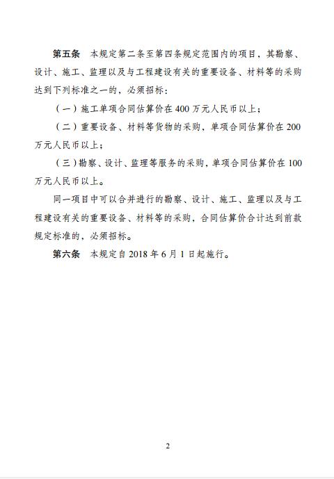 國務(wù)院批準(zhǔn)《必須招標(biāo)的工程項(xiàng)目規(guī)定》(以下簡稱《規(guī)定》),由你委公布,公布時注明“經(jīng)國務(wù)院批準(zhǔn)”!兑(guī)定》的施行日期由你委根據(jù)實(shí)際情況確定!兑(guī)定》施行之日,2000年4月4日國務(wù)院批準(zhǔn)、2000年5月1日原國家發(fā)展計(jì)劃委員會發(fā)布的《工程建設(shè)項(xiàng)目招標(biāo)范圍和規(guī)模標(biāo)準(zhǔn)規(guī)定》同時廢止。