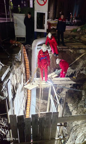 2023年10月11日,泰山燃氣集團所屬肥城泰燃巡線員在對頤高廣場周邊巡線時,發(fā)現(xiàn)頤高廣場東北路口信號燈底座一裂縫燃氣數(shù)值達到測漏儀器最高值,巡線員立即按照上報調(diào)度中心并進行疏散警戒。在接到報警后公司立即啟動應(yīng)急搶險預(yù)案,各部門迅速響應(yīng),搶險處火速趕往現(xiàn)場,設(shè)立圍擋,組織人員、機械對確認泄漏地點進行開挖。鑒于開挖后現(xiàn)場情況復(fù)雜,工作坑深達4米多,3米以下全是河沙,滲水非常嚴重。為確保搶修安全,10月13日,公司組織召開頤高中壓管道泄漏搶修搶險專題會議,分析搶修搶險過程可能出現(xiàn)的各種問題,提出預(yù)防及處置措施,對調(diào)壓、搶險、警戒、服務(wù)、輿情等方面進行人員分工,明確責(zé)任,確保搶修安全順利。雖然做了周密的部署和準(zhǔn)備,但由于工作坑深,河沙滲水非常嚴重,投入使用的四臺抽水泵陸續(xù)出現(xiàn)問題,做好的支護在泥沙水的浸泡下,隨時有塌方的危險,搶險工作不得不暫時停止。經(jīng)總指揮與相關(guān)負責(zé)人現(xiàn)場分析立即決定:擴大工作坑,重新支護,先用管卡進行固定,待排水問題解決后,再徹底處理。